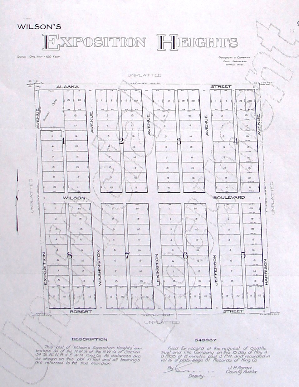 The Wilson’s Exposition Heights plat extended from NE 100th Street (bottom line) to NE 105th Street and from 35th Ave NE to 40th Ave NE. The plat was filed in May 1908.