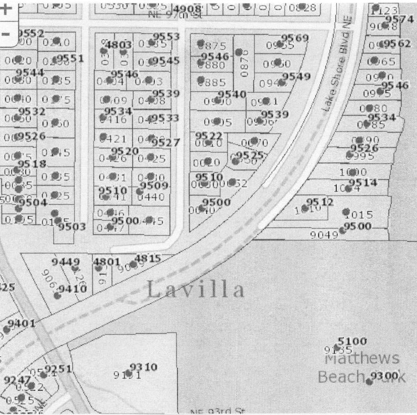 The King County property map for the area near Lake Washington at NE 95th Street is marked with the deslgnation LaVilla.