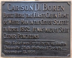 In April 1852 Carson Boren was the first to complete a cabin for his family, located at the northwest corner of Second & Cherry in downtown Seattle where the site is now marked by a commemorative plaque.