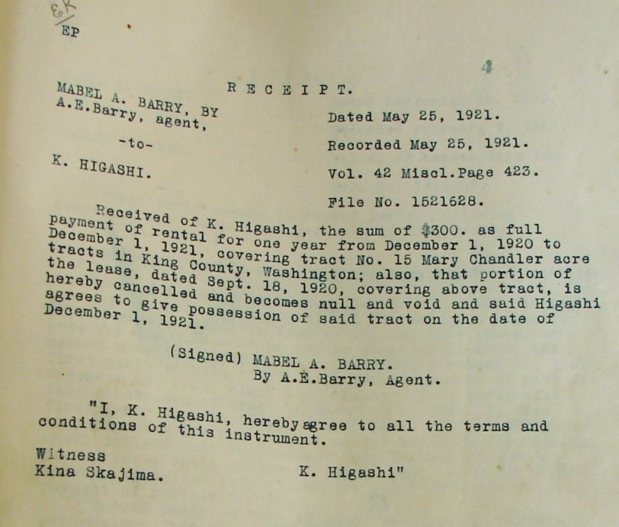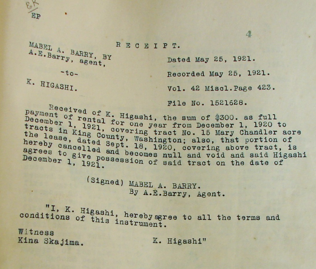Lease agreement with a Japanese farmer on what later became the Picardo Farm. The lease agreements remained in effect after Mabel Barry sold the land to the Picardos.