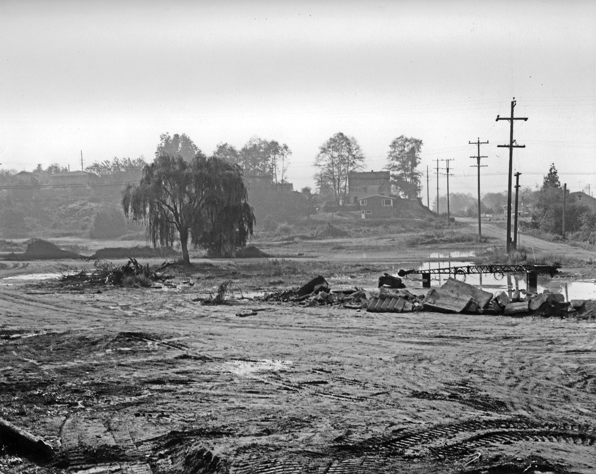 Peat removal in 1953 at the future Dahl Field, looking eastward with NE 75th Street on the right. Seattle Municipal Archives photo #28939