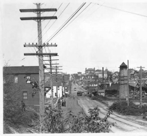 Looking north up Fremont Avenue in 1892, we see mills close to the canal and many businesses. On the horizon is the roof of the B.F. Day School.