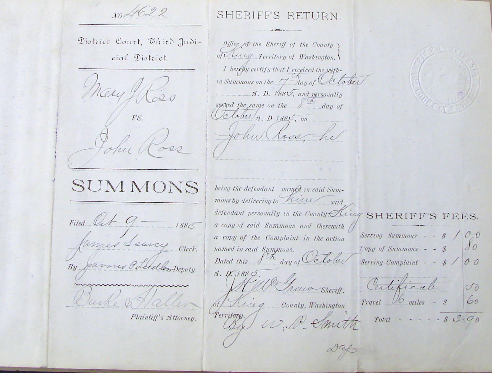 Ross divorce complaint signed by Mary Jane Ross in September 1885