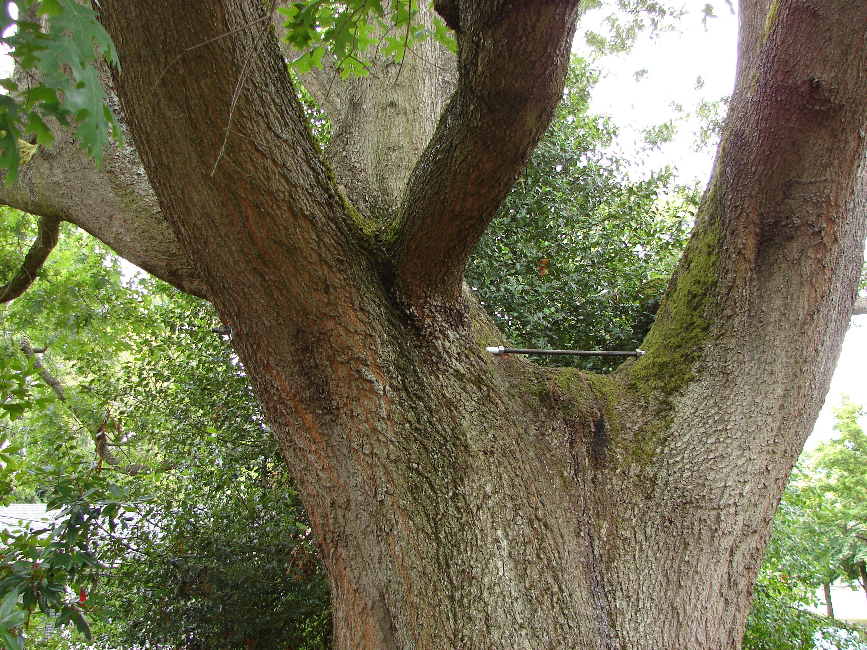 One of the bracing rods inserted all the way through heavy limbs are helping to draw them toward the center and reduce strain on the main trunk of the scarlet oak.