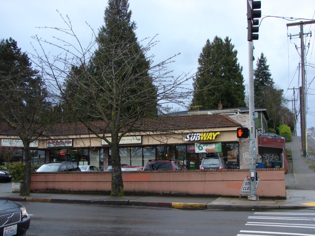 The southwest corner of the NE 75th Street intersection had a gas station which was known by a number of different names, including the Tobin & Dawson and the Lisherness Shell Service Gas, from its establishment in the 1940s, until it was torn down in the 1980s. In 1988 a storefront was built at that corner which today has a restaurant, dentist, and Subway sandwich shop.