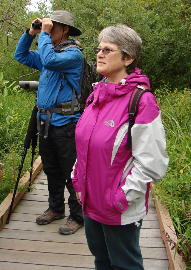 Walk leader Joe Sweeney spots a bird while Valarie’s friend Debbie is taking in the beauty of Union Bay.