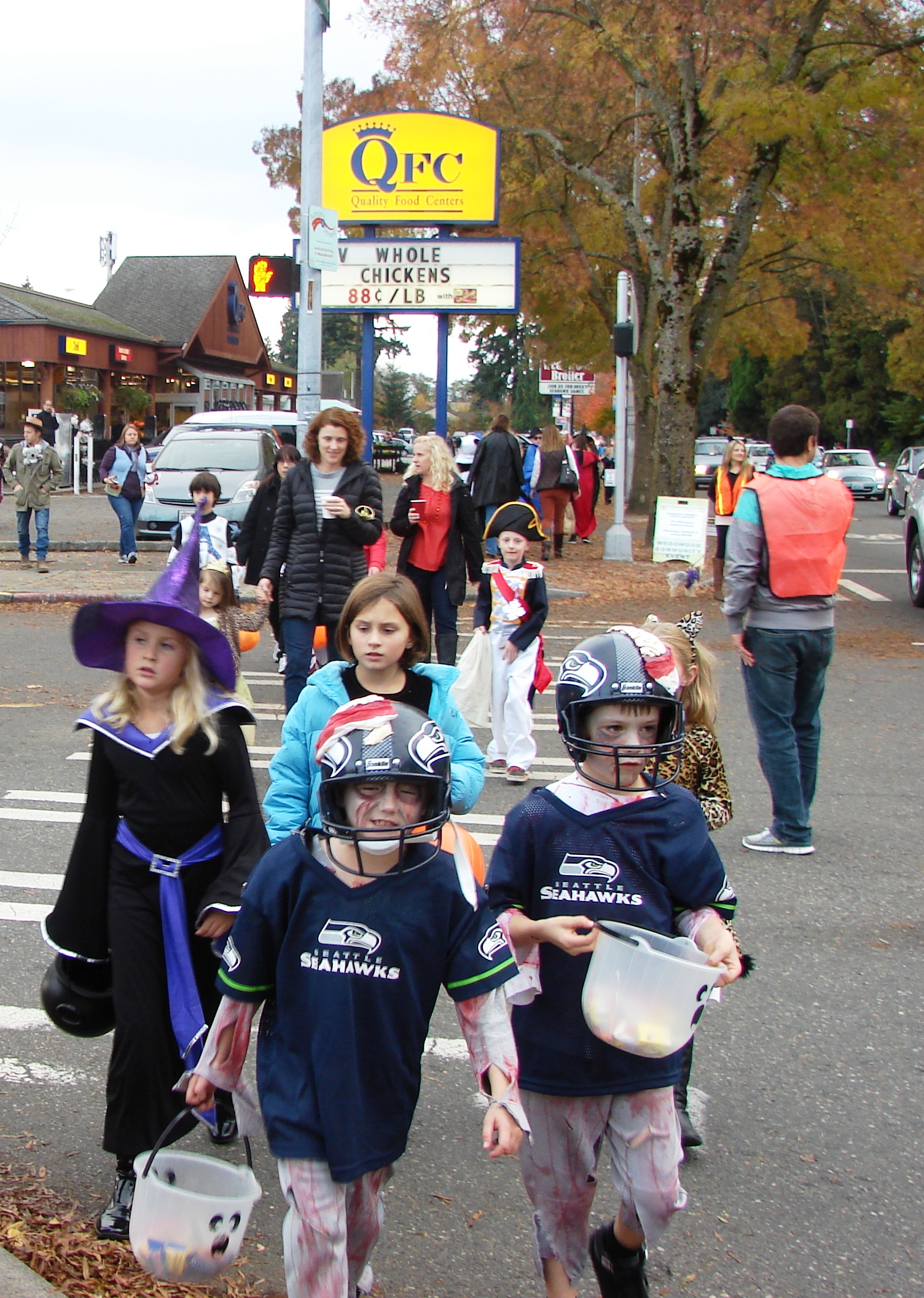 Wedgwood’s main business intersection at NE 85th Street bustles with neighborhood life at all seasons, including trick or treat in October.