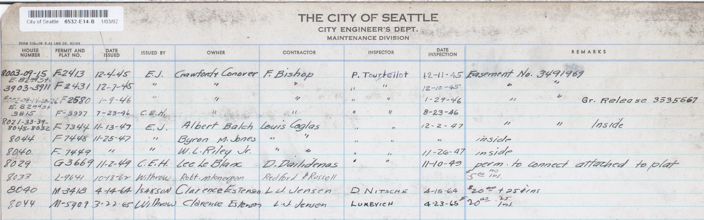 The back of the Side Sewer Card for 8008 39th Ave NE shows the list of houses on 39th Ave NE and original owners.