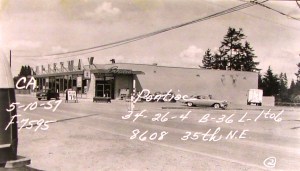 Evans Thriftway was in a 1946 grocery building which was remodelled and expanded in 1956-1957 and renamed for owner Russ Evans. The Jasper Apartments are now on this site. Photo courtesy of Puget Sound Regional Archives. The writing on the photo is the legal description with block number and address.