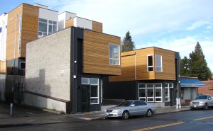 These townhouse structures were finished in early 2016 on the former site of the Big Green House at 7321 35th Ave NE. This kind of development plunked down in the middle of the retail district, is exactly what Wedgwood residents do NOT want. Photo by Valarie.