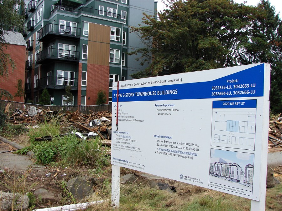 The site of 2020 NE 85th Street with its signboard describing three-story townhouses which are zoned residential housing.