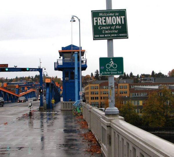 The Fremont Bridge has signs marking officilal entry to the Center of the Universe.
