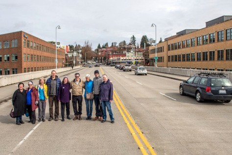 On April 8, 2017 a group from Fremont Historical Society posed on the approach to the Fremont Bridge. Photo by Jean Sherrard for Paul Dorpat’s Then and Now column.