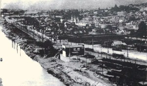 The large square McMullen Building in the foreground is shown in 1916 before completion of the ship canal. The building was at about 34th and Evanston Street in Fremont. Behind it, the long dark building is the car barn of the streetcar system on the corner of 34th and Phinney, which today houses Theo Chocolate. Photo courtesy of MOHAI; all rights reserved.