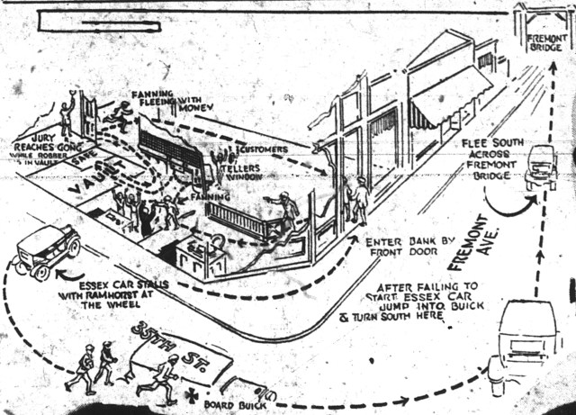 On Tuesday afternoon, September 29, three of the escaped prisoners drove around looking for a place to do a hold-up. They spotted the Queen City Bank on Fremont Avenue at the corner of North 35th Street. Their plan was to leave one man in the car at the curb, who would drive away as a decoy after the robbery, while the two men who robbed the bank would make their escape in a different direction.