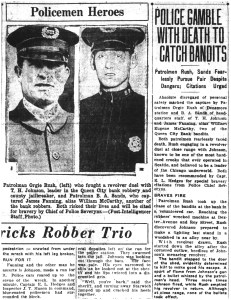 “Absolute disregard of personal safety marked the capture by Patrolman Orgie Rush (of the Wallingford police station) and R.A. Sands of headquarters staff, of T.H. Johnson and James Fanning, two of the Queen City Bank bandits. Both patrolmen fearlessly faced death, Rush engaging in a revolver duel at close range with Johnson.