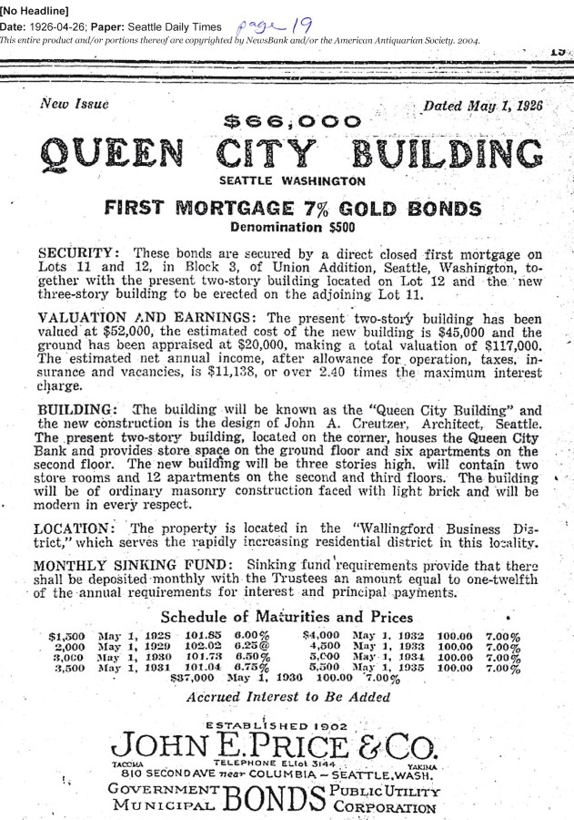 To underwrite construction of the eastern addition to the bank building in 1926, this bond advertisement ran in the Seattle Daily Times.