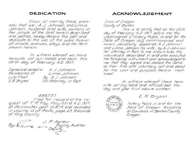 Sometimes the “why” of a plat name is in the names and family backgrounds of the plat filers, as recorded in the legal description. The owners of the Cleopatra Park Addition were Archie J. Johnson and his wife Linnie Johnson. We see that even though the property was in Ballard in Seattle, their plat filing document was notarized in Corvallis, Oregon (notary seal in the lower right corner of the document below.)