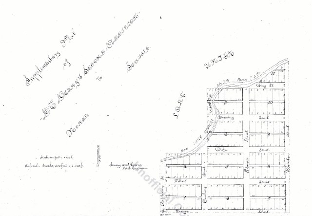 David Denny and his wife Louisa Boren Denny filed this plat in 1875. At left is the shoreline of Lake Union along what is now Fairview Avenue.