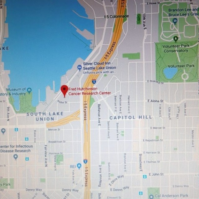 Tracing Aloha Street along its eastward course, at the southeast corner of Lake Union we see that Aloha Street is only partial and has become a driveway on the campus of the Fred Hutchinson Cancer Research Center at 1100 Fairview Avenue.