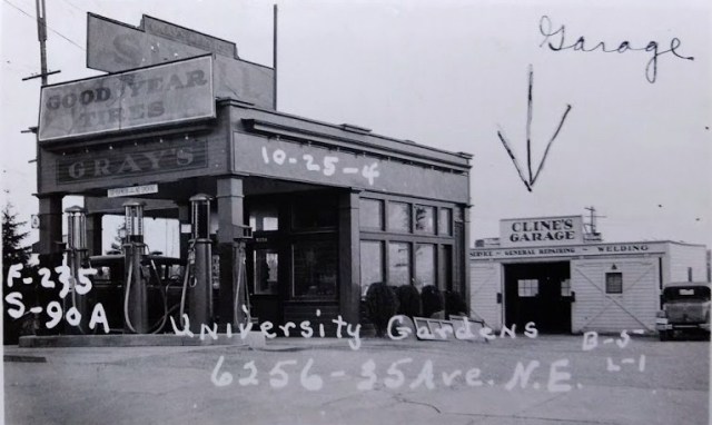 The intersection of 35th Avenue NE and NE 65th Street offered good visibility for businesses, so Elmer Gray built a gas station there in 1928. The earliest available photo of the station (below) was taken in 1938 as part of the King County property survey. The writing on the photo is the legal description 10-25-4 (Section-Township-Range) with the plat name University Gardens, Block and Lot numbers. The writing on the left, F-235, is a records file number.