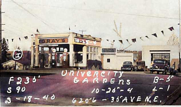 Public transportation systems such as streetcars had never reached northeast Seattle, and in the 1920s a private bus company had been organized by residents themselves. Increasing numbers of northeast Seattle families had a car, and Elmer Gray thought that a gas station in the neighborhood would be just what was needed.