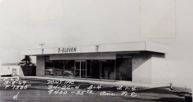 The 7-Eleven store as it looked in 1967. The writing on the photo is the legal description including the plat name, Pontiac. Photo courtesy of the Puget Sound Regional Archives, Bellevue, WA.