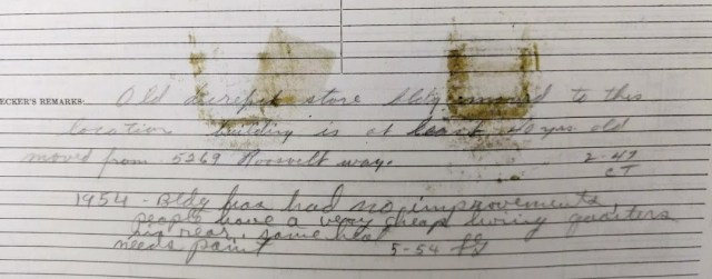 The property record card for the store building contains handwritten comments from the King County Tax Assessor’s office (photo below). In February 1947, the inspector wrote, “Old derelict store building moved to this location. Building is at least 40 years old, moved from 5269 Roosevelt Way.” Although I did not find an exact match to that address, it is possible that the store building had been located on that 5200 block of Roosevelt Way NE and had been adjacent to another store or business. The Marshalls may have bought the old building and had it moved.