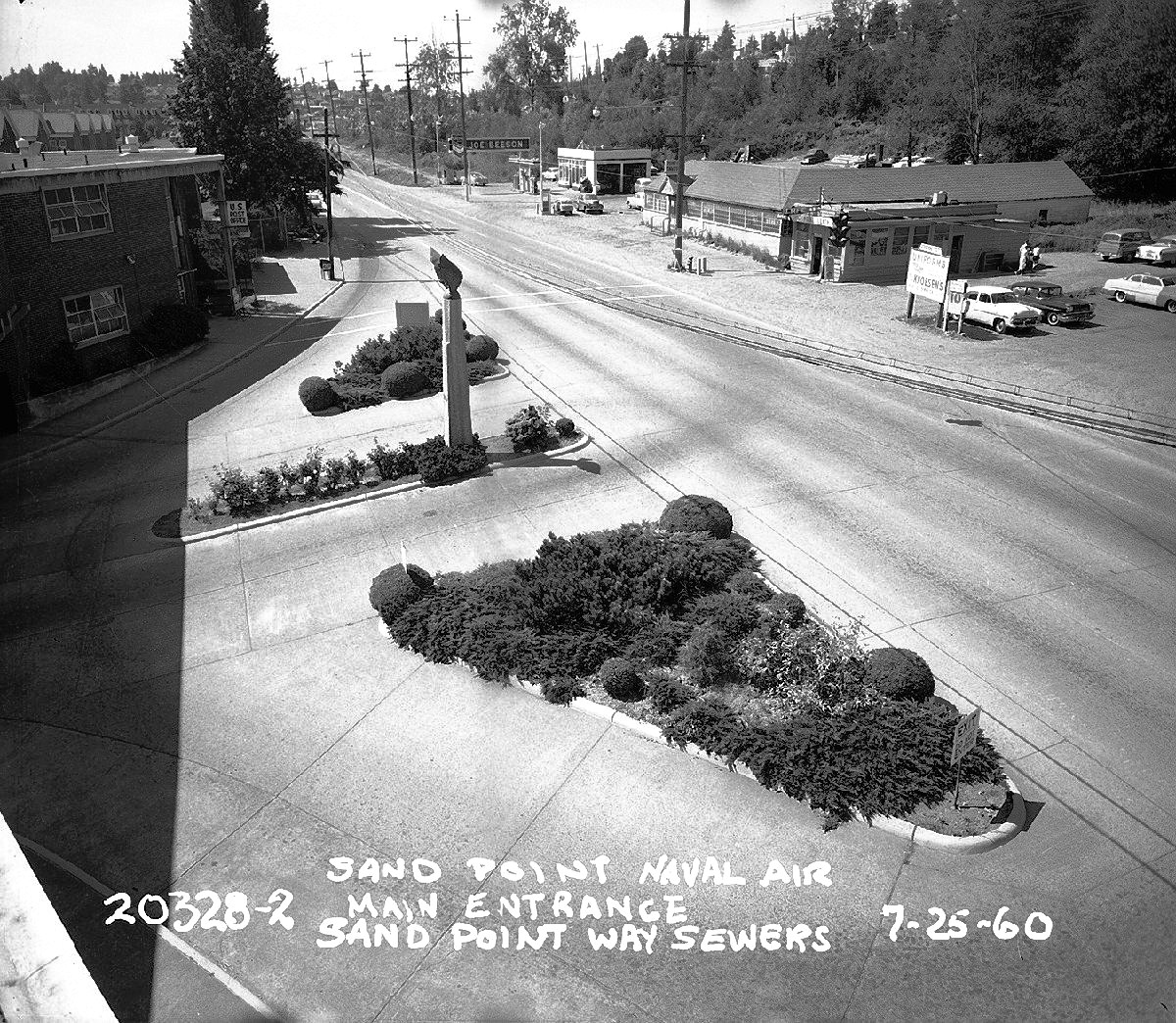 Photo of 1960, looking southward on Sand Point Way NE we see the entrance of the NAS at left and Dooley’s Restaurant at right. Photo from Seattle Municipal Archives.