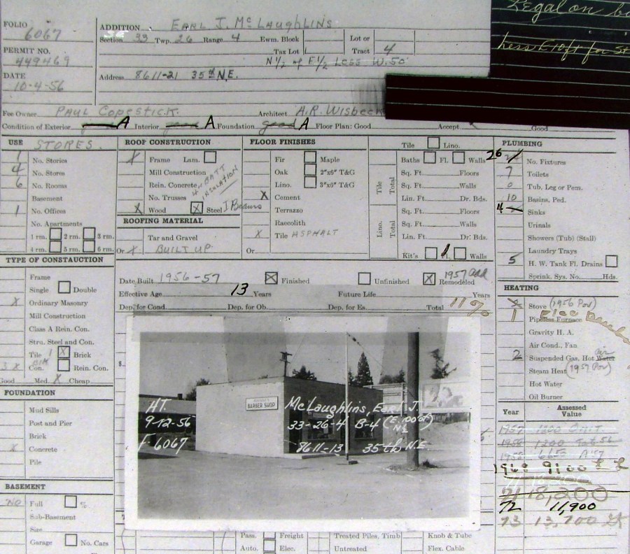 The original property record card for the Copestick building shows the two-office spaces. The legal description of the property is in the Earl J. McLaughlin plat. Record card courtesy of the Puget Sound Regional Archives, repository of the property records of King County.