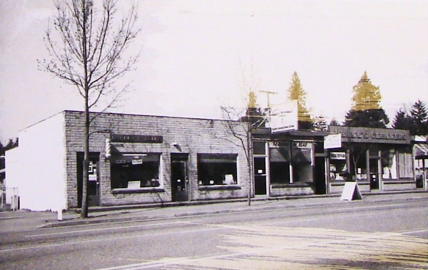 The Copestick building as of 1957 had Russell’s Barber Shop, Walt Adams Insurance, Jenny Oakvik’s Wedgwood Cafe, a cleaners and a heating & electrical contractor. Photo courtesy of the Puget Sound Regional Archives.