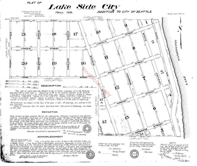 The Lake Side City plat, filed in May 1906, is from NE 105th to NE 115th Streets and is bounded on the west by 35th Ave NE.