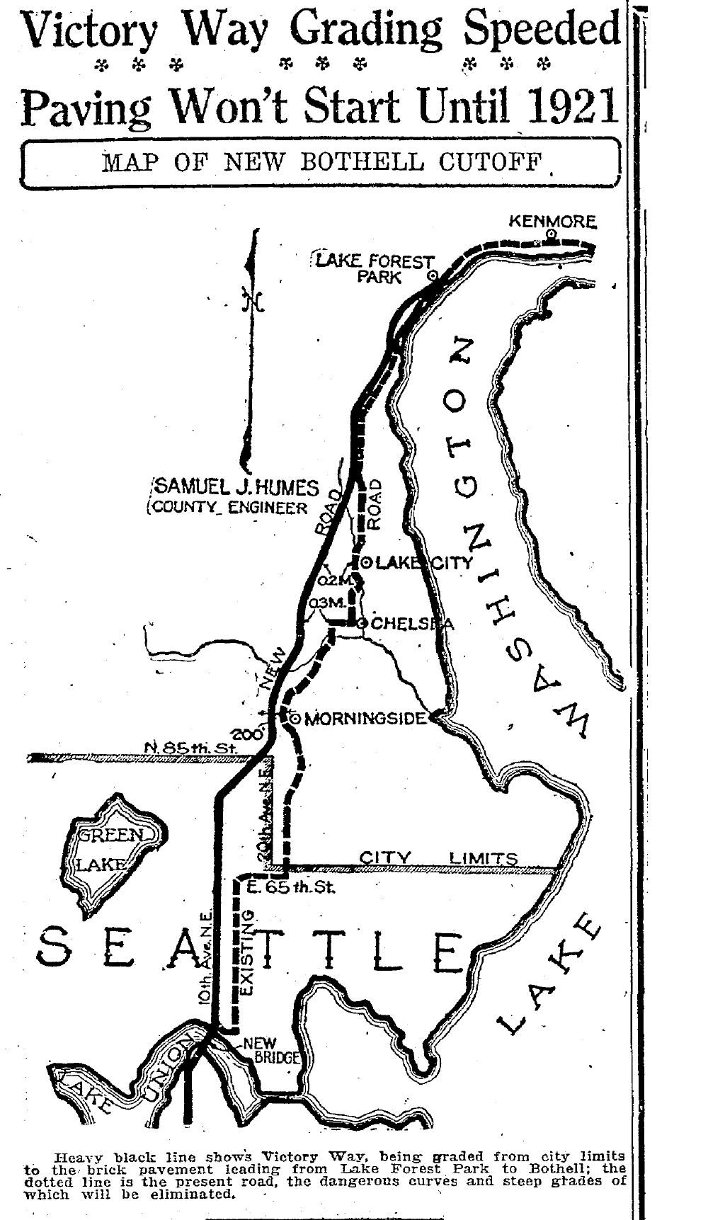 The plan for the new Victory Way in 1921 — today’s Lake City Way NE. The dotted line is the old Gerhard Erickson Road. Photo from the Seattle Daily Times of March 14, 1920, page 5.