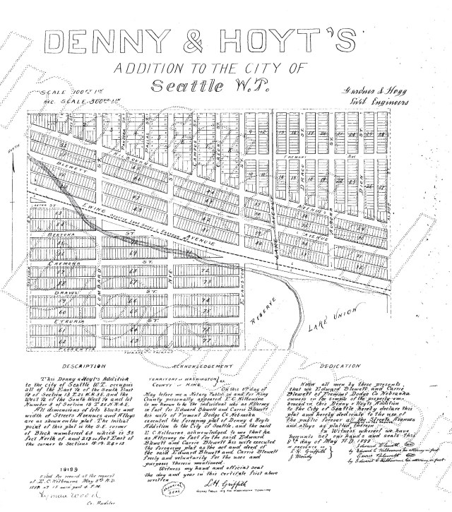 Luther Griffith was a real estate promoter who had come to Seattle from Nebraska in 1883. During the time that Denny & Hoyt acquired the Strickler property in late 1887, Griffith alerted friends back in Nebraska about the new land area which Denny & Hoyt were going to open in Seattle. In March 1888 Edward & Carrie Blewett came out from Fremont, Nebraska and offered to buy the property. They paid $55,000 of which $43,000 was in a mortgage from Denny & Hoyt. In appreciation of their help, the plat name of Denny & Hoyt’s was kept, with legal recording of the plat’s new owners, the Blewetts, on May 8, 1888.