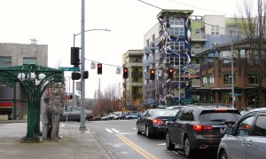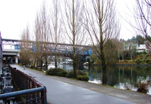 Where there was once a small creek on William Strickler’s claim property, there is now a ship canal and the Burke-Gilman Trail following the former railroad line. Here we look east along the Trail toward the Fremont Bridge.