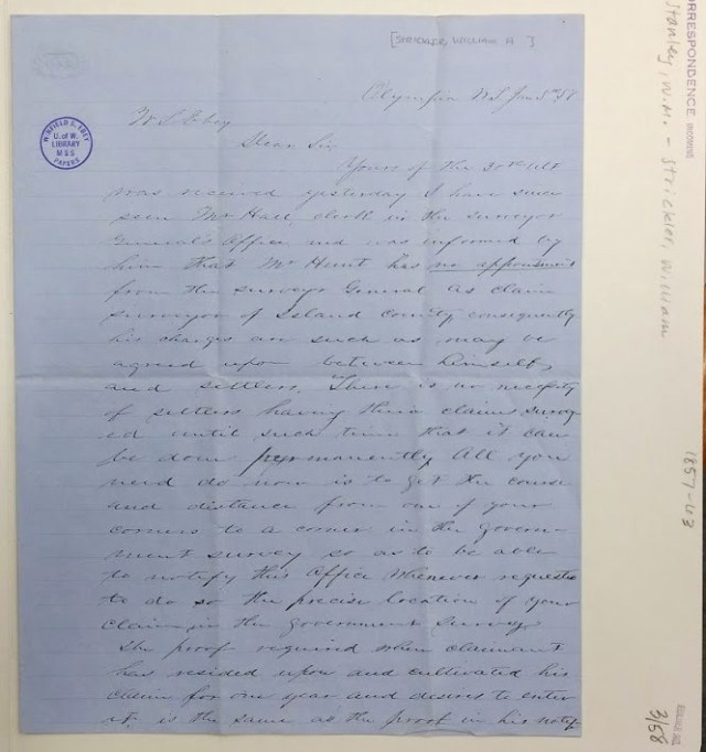 “January 5, 1857, Dear Sir: Yours of the 30th was received yesterday. I have since seen Mr. Hall, clerk in the Surveyor General’s Office and was informed by him that Mr. Hunt has no appointment from the Surveyor General as claim surveyor of Island County, consequently his changes are such as may be agreed upon between himself and settlers. There is no necessity of settlers having their claims surveyed until such time that it can be done permanently. All you need do now is to get the course and distance from one of your corners to a corner in the government survey so as to be able to notify this office whenever requested to do so for the precise location of your claim in the government survey. The proof required when claimant has resided upon and cultivated his claim for one year and desires to enter it, is the same as the proof in his notification. I am of the opinion that this claimant should prove continuous residence up to the time he desires to enter. Your Friend and obs. Servant, Wm. A. Strickler.”