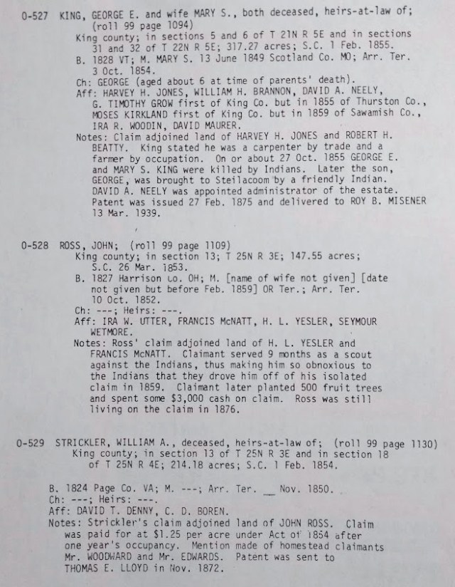 In February 1854 William Strickler paid cash for his land claim of 214 acres located in today’s Fremont, just to the west of Lake Union, as it was later named. The affiants on his claim document were David Denny and Denny’s brother-in-law Carson Boren, both original members of the Denny Party settler group of 1851-1852. Below is a page from the land claims summary showing how the Land Office later listed them as verified.