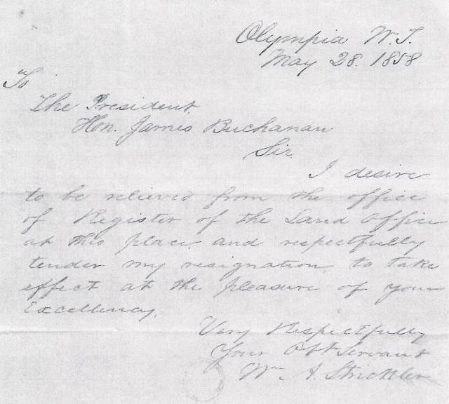 Against the background of pre-Civil War tensions in Washington Territory, William Strickler was working in the land office in Olympia from 1856 to 1858, where he had close contact with James Tilton and other officials appointed to the territorial government. We can speculate that Strickler had wanted to rub shoulders with important people. He may have aspired to be appointed to a higher government office, but instead, Strickler left his position in the government land office at the end of the year 1858. His letter of resignation, addressed to President James Buchanan, did not give the reason for wanting to conclude his service. We wonder if he did not like the job, if he wanted to do something else or if he was planning to go somewhere else to live.