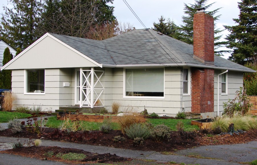 The house at 2710 NE 88th Street was built in 1939 in the first group of Fir Crest houses. It has a hipped roof consisting of four sloping surfaces adjoining the walls. The front gable (triangular form) and the visible chimney add visual appeal which varies the plane of the exterior walls.