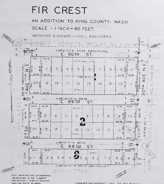 The Fir Crest plat map of 1939 shows lots laid out on NE 88th, 89th and 90th Streets between 27th Ave NE on the left, and 30th Ave NE on the right.
