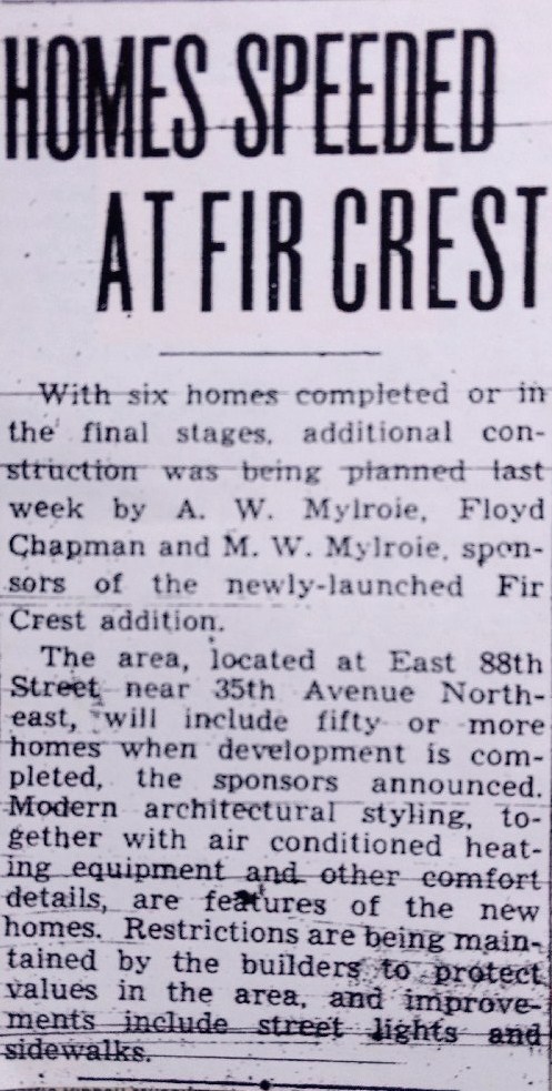 A news article on the real estate page of the Seattle Times, November 19, 1939, announced the start of new houses in the Fir Crest plat.