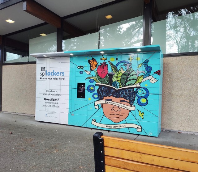 As a result of the Pandemic experience in 2020, throughout the Seattle Public Library system, some exterior lockers were added. People can arrange to have their books left in a locker for pickup. This enables those who can’t come to the library during operation hours, to check out books.