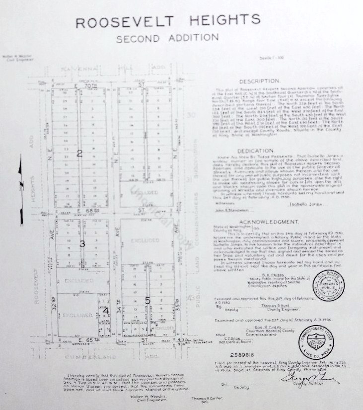 Roosevelt Heights Second Addition plat map files by Isabella Jones in 1930, included land from 32nd to 35th Avenues NE. Blank spaces marked “excluded” were the three charitable organizations who had been given their sites by Marvin Jones.