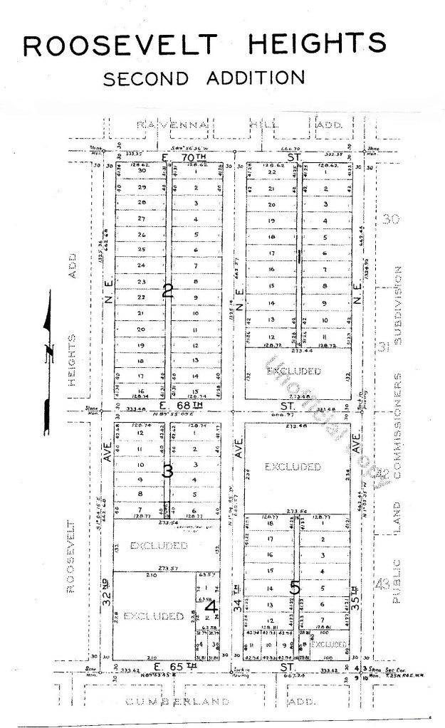 A “plat” is any area of land which has been marked out with streets and lots so that people can buy sites for houses or other buildings. Isabella Jones filed the first plat, called Roosevelt Heights, in 1919. It included only the western portion of her land between 30th to 32nd Avenues NE.
