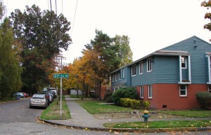 Wedgewood Estates apartments looking eastward along NE 77th Street. At left is the scarlet oak tree at the corner of 38th Ave NE. Photo by Valarie, October 2018.
