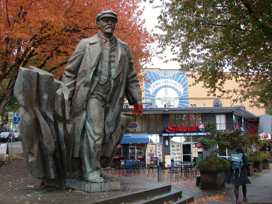 Lenin stands on an outdoor plaza in the heart of the Fremont neighborhood in Seattle. The blue banner at the top of the photo is advertising the Doric Lodge. Photo by Valarie.