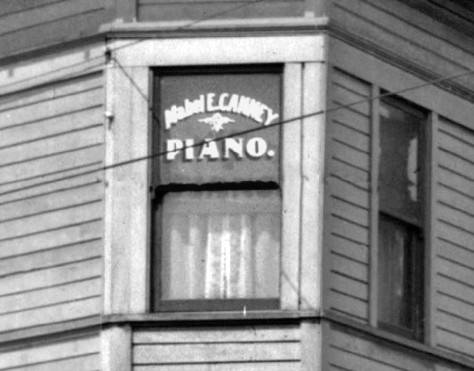 Close-up of the sign in the upstairs window of the Fremont Pharmacy building