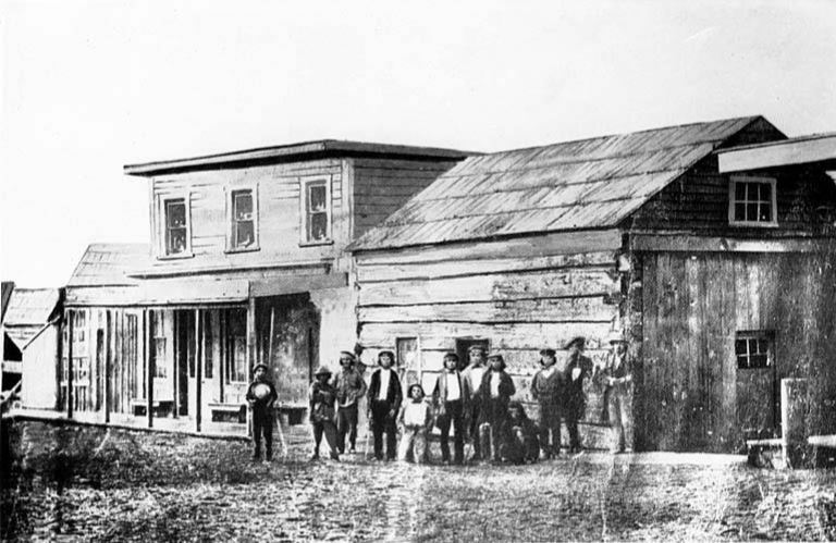 Yesler’s cookhouse at right, was built in 1853 and photographed here in 1866. Photo courtesy of UW Special Collections, Seattle group 1352.