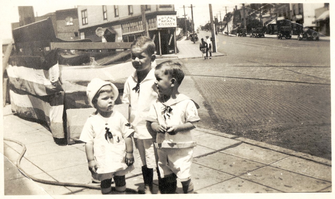 In this undated photo of the children of the Lough family, in the background we see that the Carr Real Estate office is using the former Fremont Drug Company building at 3401 Fremont Ave N.