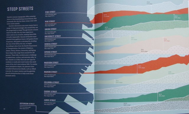 Creatively-used data in this book illuminates the connections between geography, buildings, and people’s experience of our beloved city. Would you like to know the relative density of coffee shops per neighborhood in Seattle? Then page 49 of Seattleness is for you! You can see a graphic of Seattle’s steep streets on page 98.